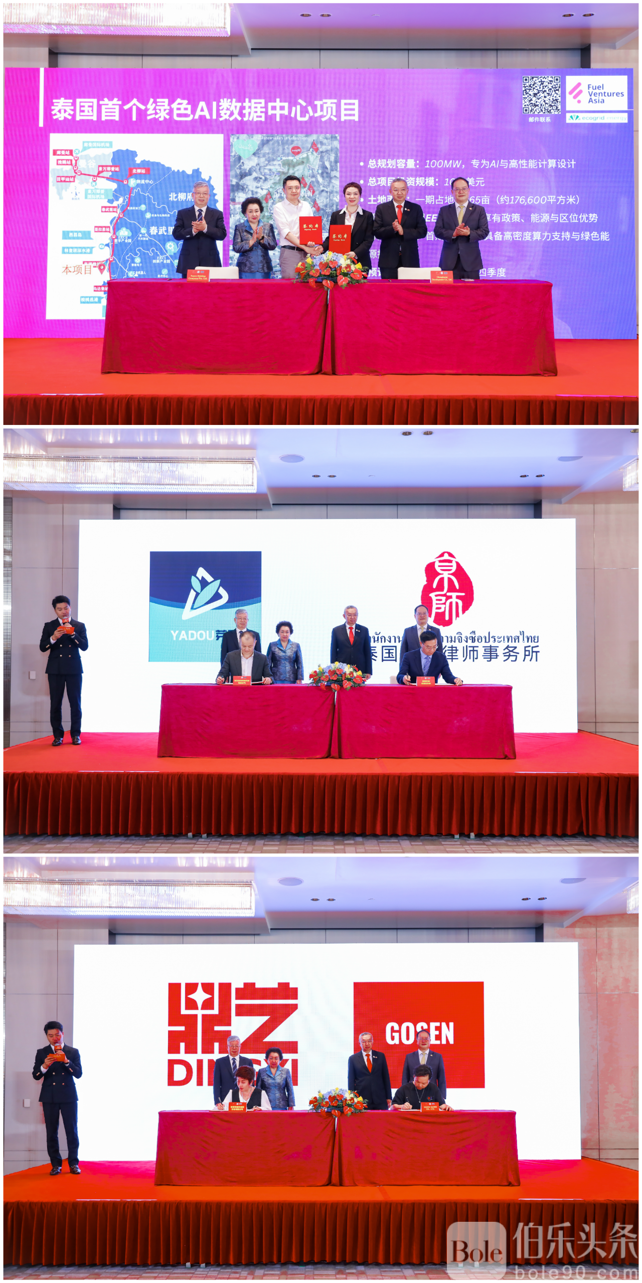 签约仪式:现场签署3个合作项目,涉及泰国首家绿色数据中心、潮玩IP、品牌管理等领域,总投资金额超10亿美元。