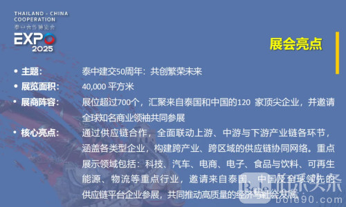 顺应全球产业加速重组、东盟经济强势崛起的时代大势,一场全新的高规格国际经贸盛会——2025泰中合作博览会,即将在泰国曼谷IMPACT国际会展中心盛大启幕。