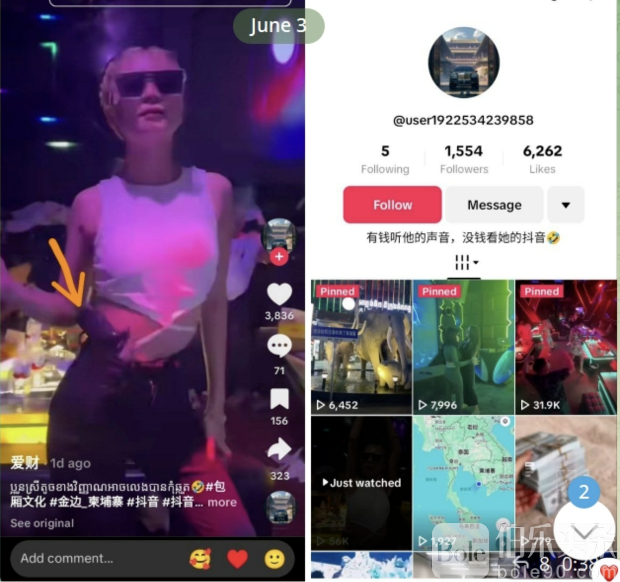 网民随后“起底”了发布该视频的TikTok账号。该账号资料栏使用中文写道:“有钱听他的声音,没钱看她的抖音。”原视频配文同样用中文写着:“精神小妹妹就是会玩,小心别走火了。”该账号发布的内容多集中在西哈努克省双狮地段周边,以及多个疑似娱乐场所的“嗨场”画面。