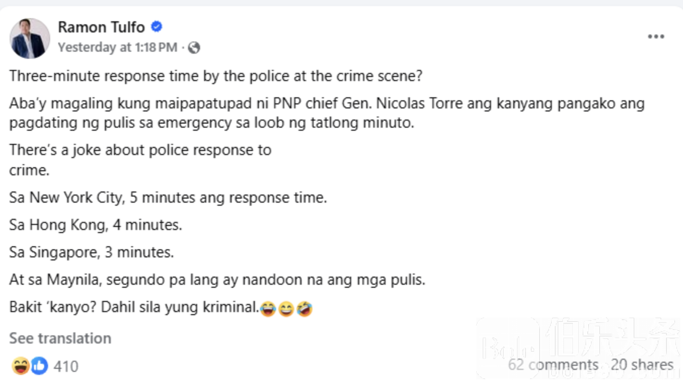 6月3日,菲律宾知名专栏作家兼媒体人拉蒙·图尔福(Ramon Tulfo)在Facebook上发文,对这一举措提出尖锐质疑。他讽刺道:“三分钟?如果托雷总长真能做到,那值得鼓掌,但现实恐怕更讽刺。”他还引用网络广泛流传的一段嘲讽言论:“纽约警方反应五分钟,香港四分钟,新加坡三分钟,而在马尼拉,警察犯罪发生前就已到场——因为他们本就是参与者。”