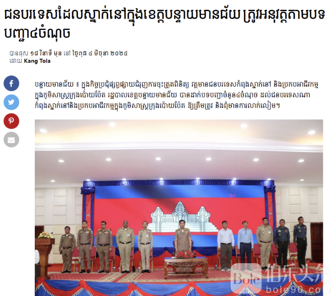 伯乐头条专讯:据6月4日报道,柬埔寨西北部边境城市波贝(Poipet)日前召开专项会议,正式公布一套针对外籍人士的全新管理制度,以应对日益复杂的居留与经商乱象,维护边境社会秩序。