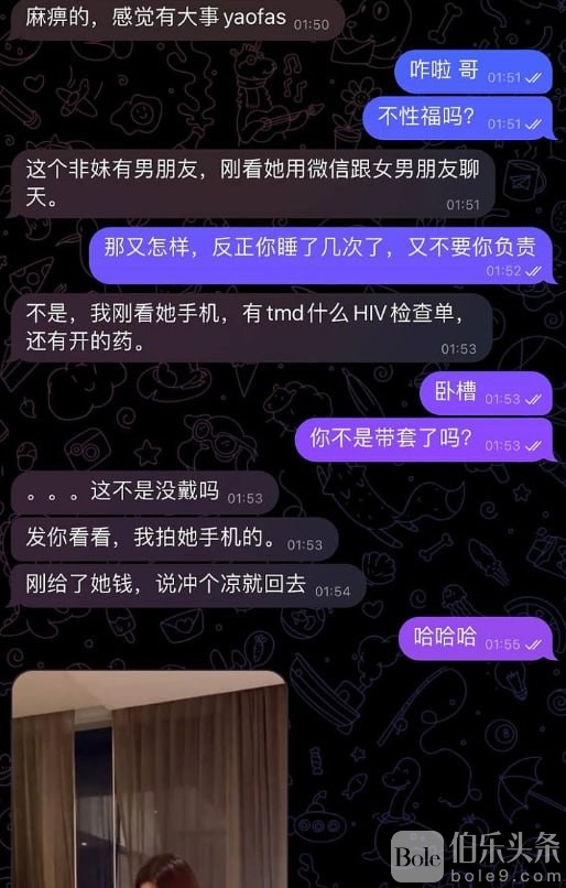 上周打完炮无意发现她跟其他男人微信聊天,趁她洗澡看她手机,还有和好几个中国人的床照,傻兄弟手机翻拍了几个个发给我,发现还有医院性病的检查和治疗单,这兄弟脑壳大了