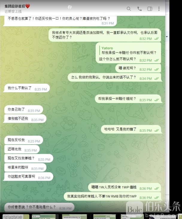 11号自己也承认说过帮我赔付一半,怪我自己赔付走人,我他妈又1W人民币不要,跑你1WP? 是我有钱还是我脑子有病,我在半岛离职后偶尔给我说几句话,赔付走了几天才来找我。