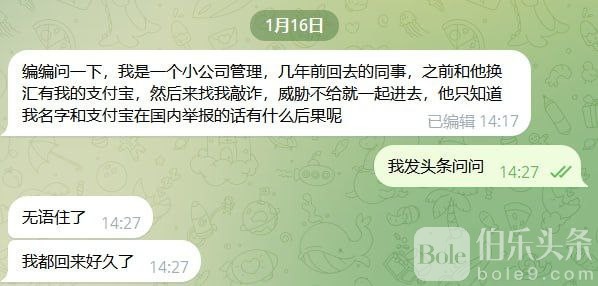 #网友投稿:我是一个小公司管理,几年前回去的同事,之前和他换汇有我的支付宝,然后来找我敲诈,威胁不给就一起进去,他只知道我名字和支付宝在国内举报的话有什么后果呢?