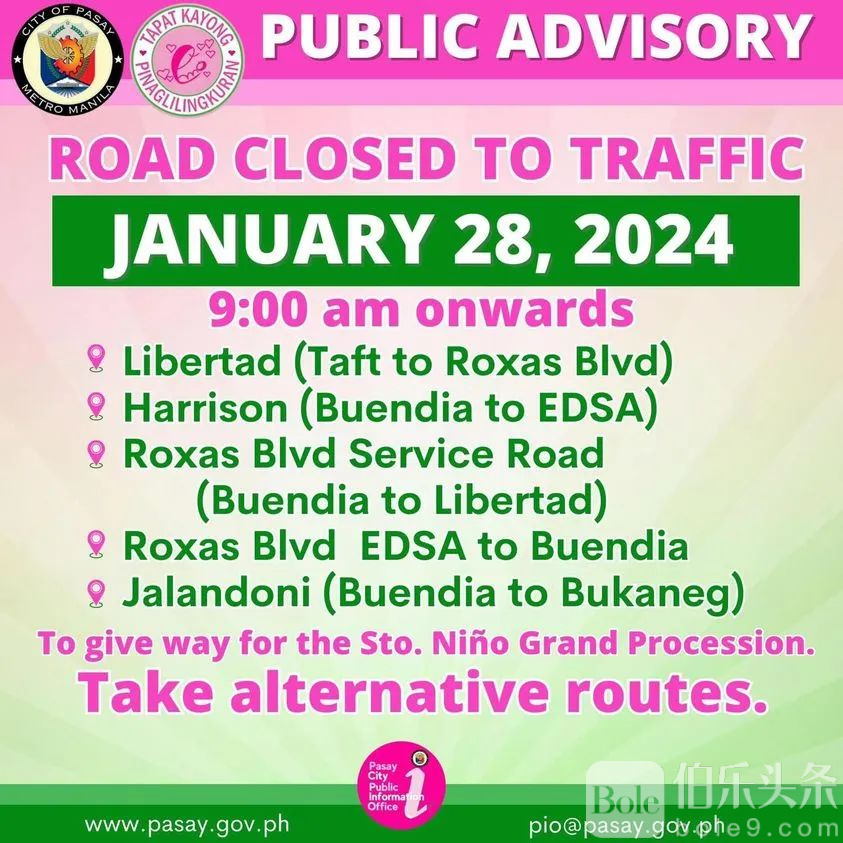 1月26日消息,菲律宾帕赛市政府宣布,1月28日,该市部分地区的道路将被关闭,以便为圣婴盛大游行让路。