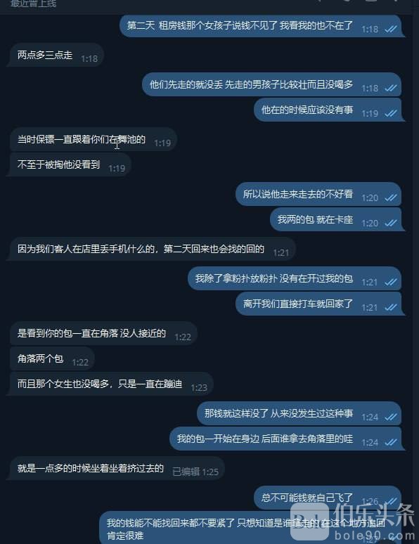 我的女性朋友丢了四万多,我的兄弟丢了15000,而我自己丢了将近4万。朋友想看监控,但酒吧方面却在拖延,说要找各种人,还说不允许外人进入办公室监控。