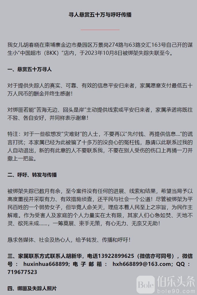 金边万景岗(BKK),开超市的胡春晓在2023年10月8日,在自家超市被绑架到现在都没消息