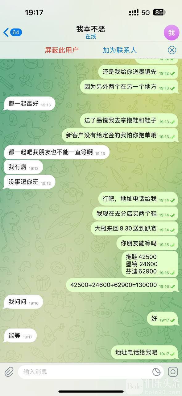 本人是代购员在菲代购五年,第一次遇到这么丧心病狂的人 此人第一次找我购买东西由于没有共同群和看不到用户名,要求他付定金墨迹几个小时都没有,由于新客户,本人想促成生意十分耐心的周旋,从白天拖到黑夜,最后十分坎坷的完成交易。 此后三番两次每天来问我,我非常不愿意做他生意,他坚持要钓我这条翘嘴。而我这条翘嘴上钩了03月02号找我下单一个宝格丽戒指,又是从白天等到黑夜说他去取钱。