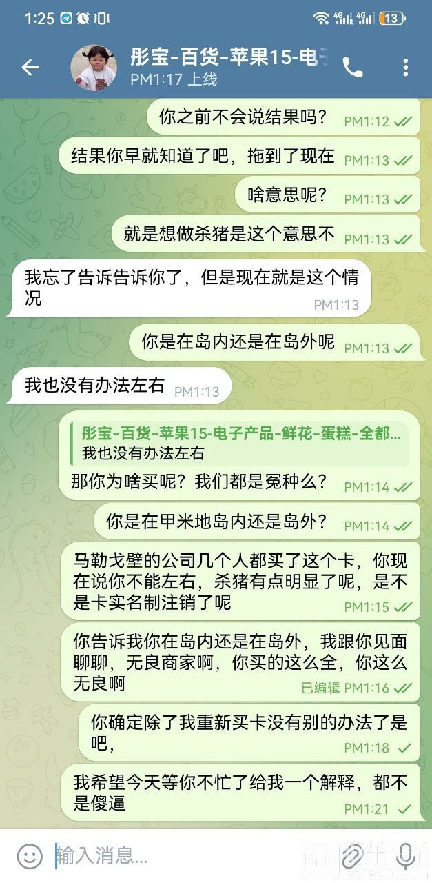 然后过了两天又说运营商维护,我说其他的怎么可以使用他又对我说部分用户维护,一直让我等,等了一个月告诉我这个卡不能用了需要买新卡,我操他妈这是纯纯的杀猪啊。