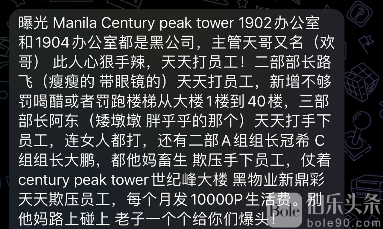 还有二部A组组长冠希 C组组长大鹏,都他妈畜生 欺压手下员工,仗着century peak tower世纪峰大楼 黑物业新鼎彩 天天欺压员工,每个月发10000P生活费。