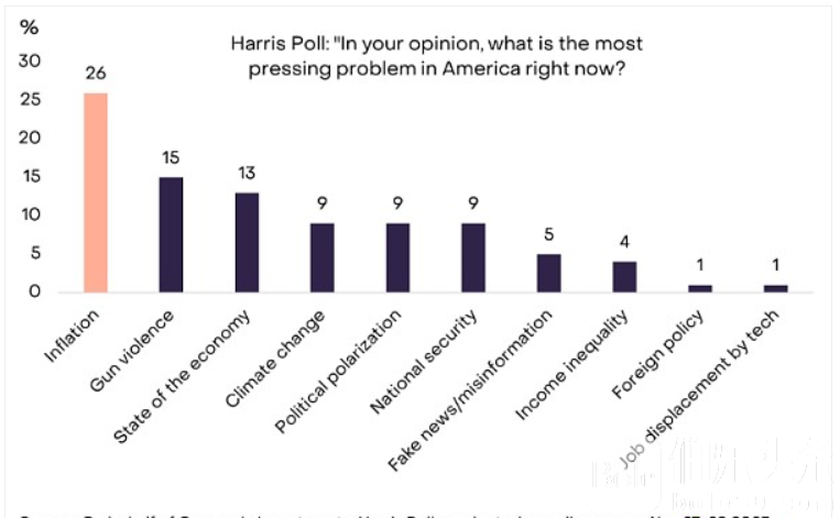 由于两位候选人领导下的公共债务都可能增加,因此更重要的考虑因素可能是任何一方是否同时控制白宫和国会。 根据目前的做法[9],在国会获得简单多数的政党就可以通过财政政策立法,特朗普总统和拜登总统都在任期开始时在统一政府下颁布了重大立法。 对比特币的影响:如果一党同时控制白宫和国会,需求可能会上升,因为通过扩大赤字的立法会更容易。 宏观问题#2:通货膨胀和美联储独立性灰度与 Harris Poll 合作,调查了可能的选民对加密货币和即将到来的选举的看法。 引人注目的是,受访者表示,通货膨胀是该国最紧迫的问题(图表 3)。 图表 3:通货膨胀是美国最紧迫的问题