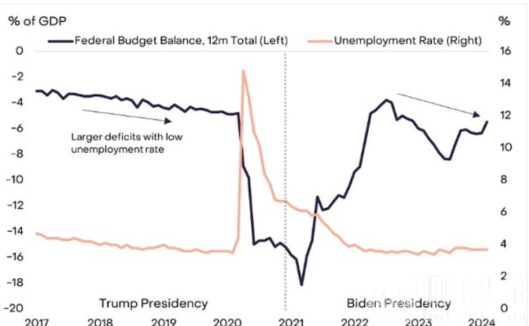 特朗普总统和拜登总统都留下了政府债务不断上升和顺周期预算赤字的记录,尽管大流行使解读这两种情况的历史记录变得更加复杂。在大流行之前[5],尽管失业率下降,特朗普总统仍导致公共债务水平上升,预算赤字扩大(图表 2)。[6] 政府分析师还估计,2017 年税法在中期增加了预算赤字。 [7] 大流行之后,拜登总统在联邦预算赤字增加、失业率保持在历史低位的时期也进行了类似的执政。 此外,两位候选人都没有在第二任期内优先考虑平衡预算。 特朗普总统表示,他希望实施额外减税,而估计拜登总统的绿色能源投资计划将大幅扩大赤字。 [8] 图表 2:特朗普总统和拜登总统均在巨额预算赤字下执政