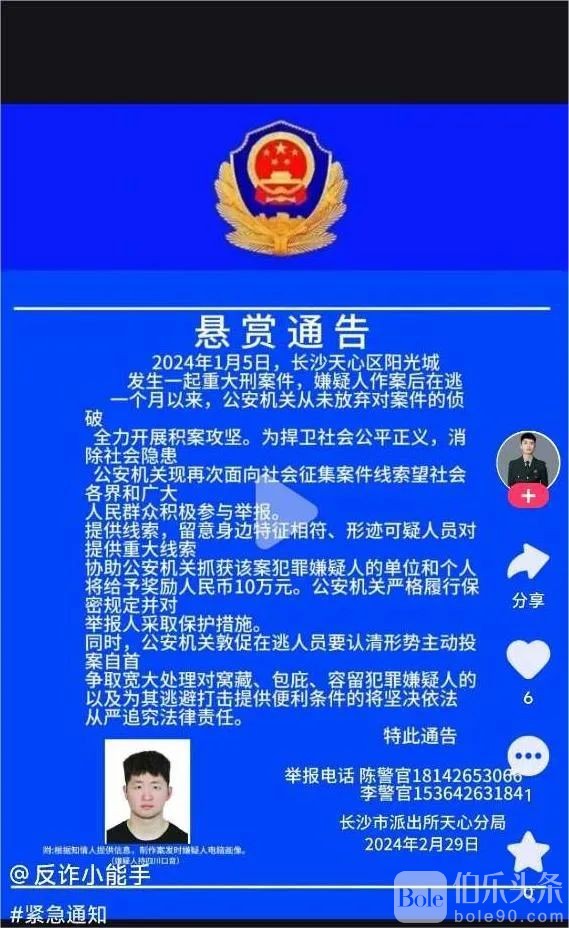 2月29日,网民“反诈小能手”发布视频,视频内容为带有警徽的《悬赏通告》,通告称近期长沙天心区发生重大刑事案件,拟向公众有偿征集线索,并附所谓嫌疑人图片及民警联系方式,落款为“长沙市派出所天心分局”。