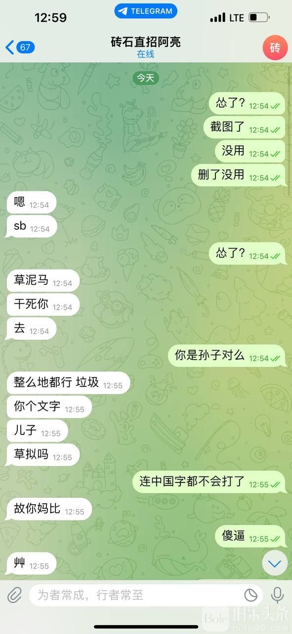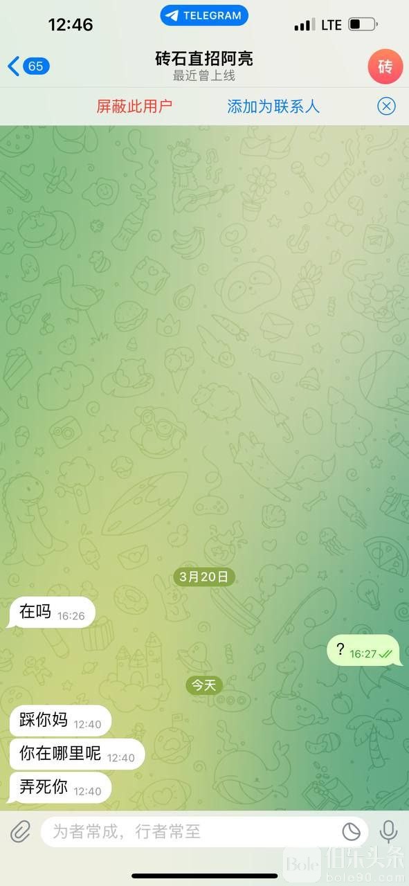 然后这次我去面试,我去钻石,我问我朋友是不是这家公司,他说是,我去看了看,他这边就开始给我发消息问我来不来上班,我说我不去 我考虑下,考虑好了再去上班,结果,把我的飞机ID发给很多甩人群找工作群,很多人以为我又再找工作,然后过来骂我威胁我,要弄死我来,你他妈的,不过来弄死我,你跟我姓