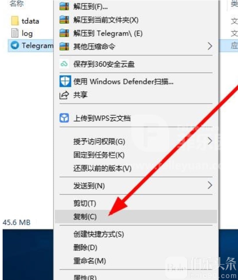 2、右击文件中Telegram选择复制
