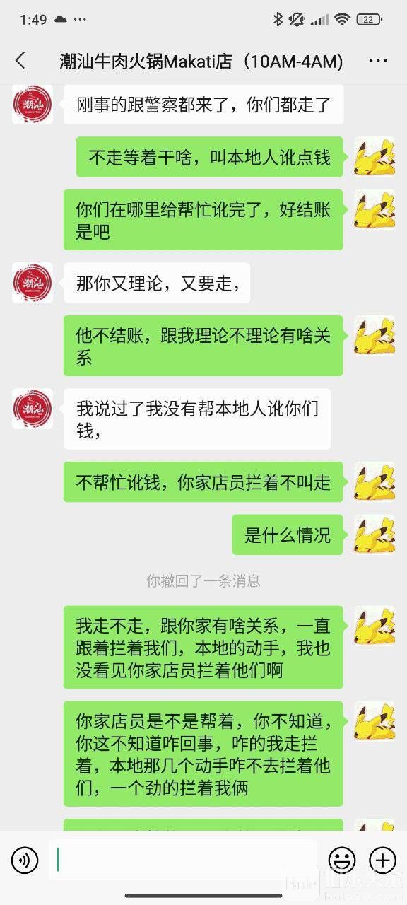 在我们要结账走人的时候,神奇的事情发生了,潮汕火锅的,店员帮着本地的拦着不叫走,详情请看聊天记录,看看人家回的有多搞笑,要不是跑的快,吃饭花2000p被讹那就不知道多少了了。