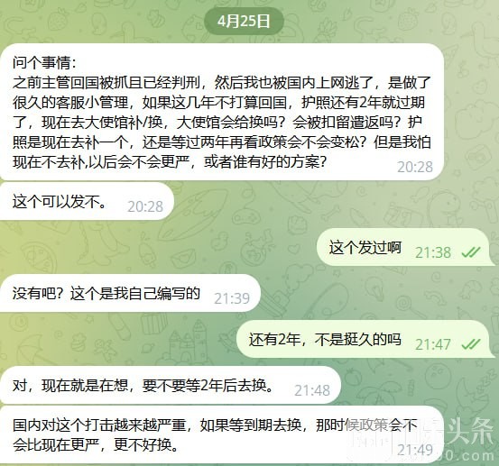 之前主管回国被抓且已经判刑,然后我也被国内上网逃了,是做了很久的客服小管理,如果这几年不打算回国,护照还有2年就过期了,现在去大使馆补/换,大使馆会给换吗?会被扣留遣返吗?护照是现在去补一个,还是等过两年再看政策会不会变松?但是我怕现在不去补,以后会不会更严,或者谁有好的方案?