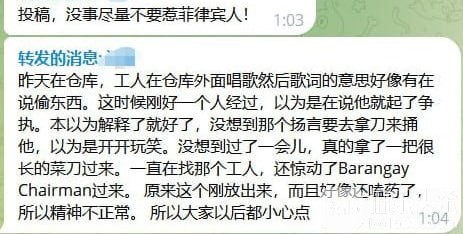 没想到过了一会儿,真的拿了一把很长的菜刀过来。一直在找那个工人,还惊动了Barangay Chairman过来。 原来这个刚放出来,而且好像还嗑药了,所以精神不正常。 所以大家以后都小心点。