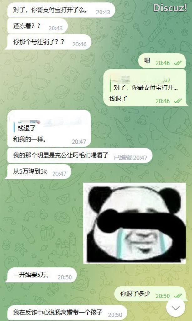 案例二:本人之前是找一个熟人u换人民币,之前换了很多次都没事,后面有一次换了16000多u  折合人民币10万,是给我转的2笔5万的支付宝,其中有一笔就涉案刷单了,当时也是想的可能是正常风控,没想到第一次冻结6个月,因为之前也有很多冻结6个月就自动解封的,然后就没管,结果6个月到了又续冻了,没办法只能找浙江刑侦那边说明情况是换汇导致的,并且还有保留当时的聊天记录,当时那边看了聊天记录证据也确信我说的是对的,但是这钱是一位裸聊受害者转入的钱,最后没办法只能退回去了这一笔,不然不给解封的,后面这钱被扣掉了然后才给我支付宝解封的。