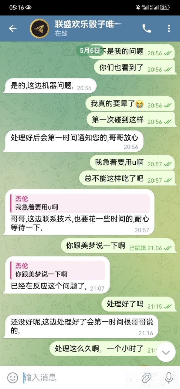大家可以看一下我跟财务的聊天记录 31分财务跟我说叫联系技术处理了  56分财务跟我说 是他们平台的问题  中间25分钟也查清楚了吧 财务说了他们自己的问题  平台的问题是不是应该就把本金退给我 还是说他们联盛财务说的话都是不算数的?  我相信 如果这事发生在kk国际那边 人家早就处理好了 也不至于这样  我只要求退回本金