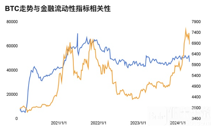 图二:全球央行购买黄金趋势 https://china.gold.org/gold-focus/2024/03/05/18561 1.2 美元指数上涨1)美国经济内需稳健,延后了降息预期。美国23年Q4的经济数据表明当前经济具有一定韧性,24年Q1则表明目前美国内部供不应求,需依靠海外进口供给。并且通胀反复的数据降低了降息的必要性,保持紧缩的货币政策稳定美元的需求促使美元上涨。 2)美元受国际汇率影响被动上涨,例如瑞士意外提前降息。倘若其他货币出现货币宽松政策,由于利差导致美元相对其它国家的汇率上升,进而推高美元指数。 3)美元作为世界货币,承接一部分避险需求。当地缘危机不涉及美国本土时,美元的避险属性将部分显露,此时和黄金同效应。 1.3 为何双双走强原因一:美元与黄金都具有避险资产的属性,当突发性风险事件集中发生,导致地缘政治危机或经济危机恶化时,市场避险情绪过强,会形成双双走强的局面。同时,黄金的商品与金融属性影响力度小于避险属性。对于美元而言,美国保持紧缩的货币政策,而其他经济体货币走弱,支撑美元走强。历史中也发生过类似的情况,例如1993年的美对外干涉失败、2009年欧洲主权债务危机、中东局势不稳定等。 原因二:尽管美元短期呈现走强的趋势,部分央行减持美债增持黄金的行为也暗示着对美元霸权的抵抗,局部出现去美元化趋势,应当警惕美元信用危机。 从黄金走势来看,短期内黄金的走势主要取决于伊朗是否会大规模报复以色列,若地缘形势持续恶化,那么黄金有继续飙涨的可能。从美元指数走势来看,目前部分其他主权货币都具有更早降息预期,例如欧元、英镑,而瑞士央行已提前降息。此中美元依然具有利差空间,未来可能依然具有一定的支撑力。 2 具有流动性风险不确定性2.1 市场流动性受阻金融市场流动性是我们判断未来市场走势的重要指标。年初的小牛市也是因为BTC ETF的通过带来传统资金的流动性以及美联储鸽派发言导致流动性短期内上升,最后因为整体金融市场缺乏流动性而出现回调。 金融市场经常通过真实流动性指标 = 美联储负债规模 - TGA -逆回购 = 金融机构存款 +流通中的货币 + 其他负债,衡量市场流动性。例如图中,我们能够发现上一轮周期BTC与金融流动性指标呈正相关的关系,甚至有过拟合的趋势。因此,在流动性充沛的环境下,市场的风险偏好将得到提升,尤其在加密市场流动性的影响将得到放大。