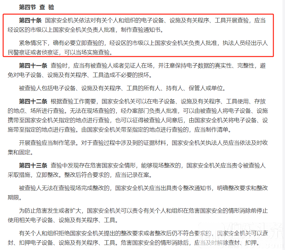 其中第40条规定,国家安全机关依法对有关个人及组织的电子设备、设施及有关程序、工具进行查验,应当经设区的市级以上国家安全机关负责人批准,制作查验通知书。