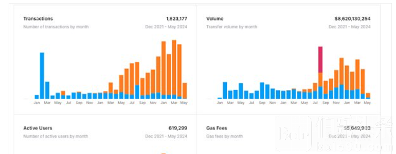 根据Axelar的区块浏览器,Axelar网络的跨链活动交易笔数为182.3万,交易量为86.2亿美元,平均交易量为4728美元。
