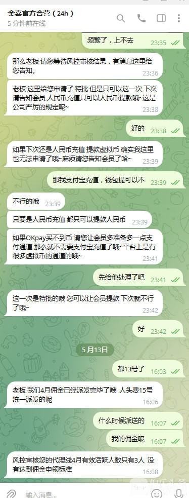 金喜体育 杀猪盘。充值提就没用过他家的银行通道,然后他家银行卡出问题跟我几把的关系,前面我自己提现虽然不多但是不让提 后面我朋友也遇到过一次,好说歹说处理好了。目前就是各种风控 佣金不给结算。什么都是他们说的算