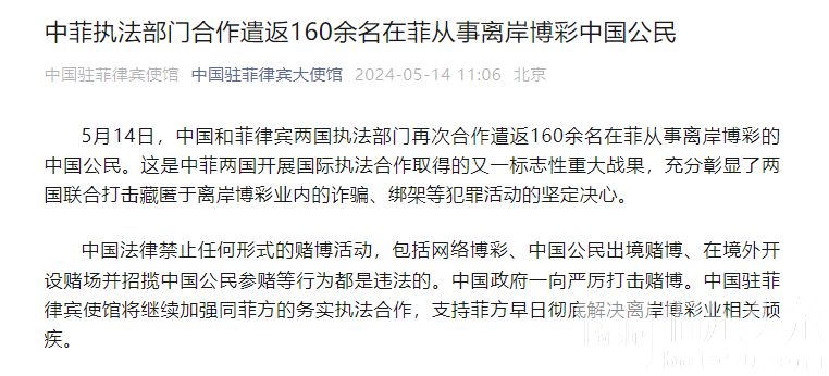 5月14日,中国和菲律宾两国执法部门再次合作遣返160余名在菲从事离岸博彩的中国公民。这是中菲两国开展国际执法合作取得的又一标志性重大战果,充分彰显了两国联合打击藏匿于离岸博彩业内的诈骗、绑架等犯罪活动的坚定决心。