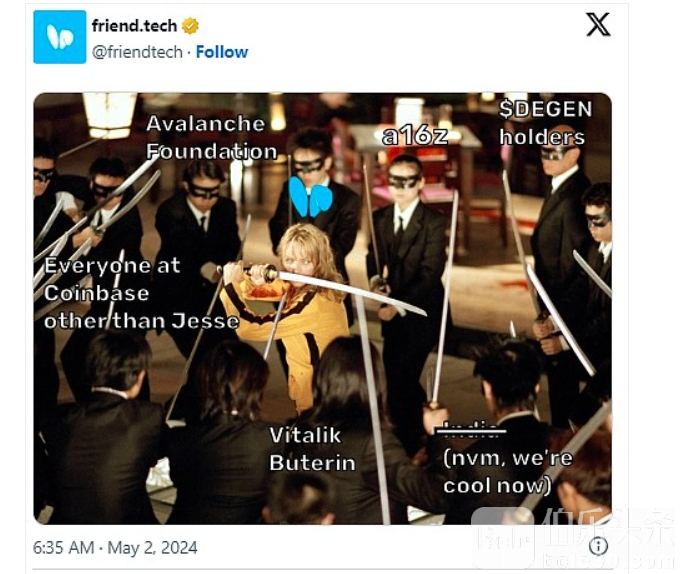 Friend.Tech被低估了首先,我们来看看牛市的情况。 FRIEND 的增长取决于其与 Base 的密切联系、公平的发布、低市值、强大的领导力和应用程序实用性。 FRIEND = Base:可以说是去年启动 Base 的项目,FRIEND 可以被视为最“Base”的代币——是Base链成功的综合代表。 它是最热门应用程序的原生代币,是社交/消费者链的社交代币。 目前,Base 声称他们不会推出可能为 FRIEND 的地位增长留下空间的代币。 公平发布,低市值:FRIEND 的市值极低(约 1.55 亿美元),该项目由业界最著名的风险投资公司之一 Paradigm 支持,目前没有为其投资者保留供应。 Racer=个性角色:大多数表现良好的项目往往都有很强的个性,作为社区的领导者进行协调。 Friends.tech 的创始人 Racer 将这一角色具体化为一个两极分化的网络人物,既有忠实的支持者,也有直言不讳的批评者。 组群所需:组群的密钥,V2 的新群聊功能,以 FRIEND 定价,这让代币具有了一种功能,而不是像“在治理中投票”那样随便乱用的用例。