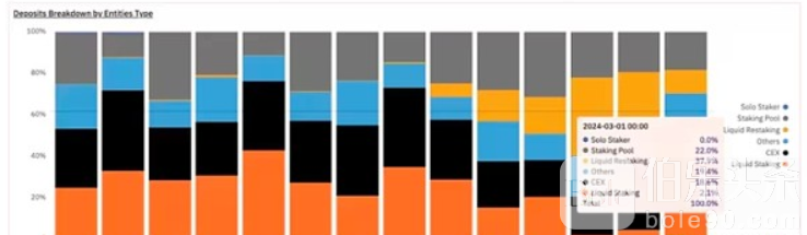 再质押是新的催化剂再质押一直是以太坊上令人兴奋的原语。 与 EigenLayer 和 Liquid 再质押协议的积分计划一起,它创造了新一波 ETH 质押需求。 2024 年 3 月和 4 月,分别有 38% 和 48% 的质押量来自流动性质押协议。 与此同时,EigenLayer 超过 65% ($9.7B) 的 TVL 来自原生 ETH,这显示了再质押能够给以太坊带来的吸引力。 随着再质押的成熟和采用,我们可以看到未来更多的质押量来自再质押和流动性再质押。 然而,还需要注意的是,再质押会带来风险,例如智能合约和积极验证的服务的质量。 鉴于 EigenLayer 的奖励和削减机制尚未激活,我们还没有看到再质押带来的后果。