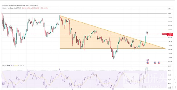 BTC/美元,4 小时图。 然而,比特币的相对强弱指数(RSI)在5月16日达到77的峰值,然后回落到目前的66。 虽然这表明比特币的交易价值是公允的,但在比特币价格有更多上涨动力之前,它可能需要跌至50左右。