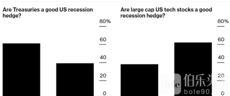 资料来源:彭博社 5 月 6 日至 10 日的 MLIV Pulse 调查。 这一回应突显了 Nvidia Corp.、Amazon.com Inc. 和 Meta Platforms Inc. 等公司的主导作用。 随着它们扩大对经济主要领域的影响力,它们正在美国金融市场上发挥作用。 这使他们能够产生稳定的利润,引发反弹,使投资者相信他们将继续成为稳定收益的来源。 美国通胀较2022年的灼热水平已大幅回落,但今年前三个月超出了经济学家的预期,并始终高于美联储2%的目标。 这使得物价上涨成为投资者最大的担忧。 大多数受访者(393 名受访者中的 59%)将通胀复苏视为从现在到今年年底金融市场面临的头号尾部风险。 下一次消费者价格指数定于本周三公布,可能为 3.4% 左右。 例如,自 2021 年 3 月通胀率首次升至 2% 以上以来,英伟达 (Nvidia) 股价已飙升六倍多。即使是经历过高峰和低谷的苹果公司(Apple Inc.)在这段时间内的表现也优于大盘,涨幅超过50%,而标普500指数的涨幅约为30%。不过,与其他成长型股票一样,科技公司对通胀和利率的变化很敏感,因为它们的估值很大程度上取决于未来的利润。 大约四分之一的受访者指出,美国经济衰退是 2024 年的最大风险。调查显示,在这种情况下,国债而非股票将提供更好的保护。 债券击败股票成为抵御经济衰退的盾牌