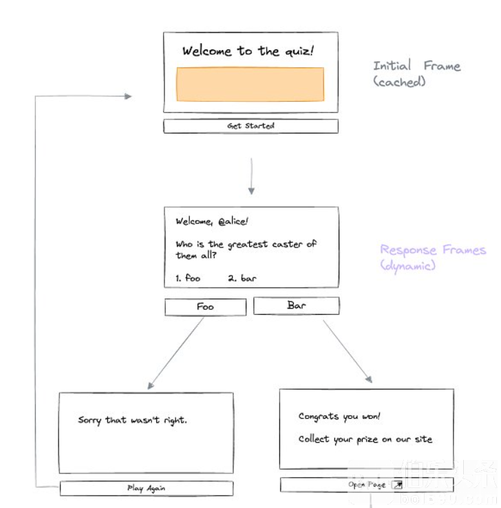 6、无需许可 从这些协议和原则中,我们看到新的原语出现了。其中,Farcaster的Frame获得了相当多的关注。 Frame让自定义体验注入Farcaster信息流成为可能。它扩展了Open Graph标准,并通过添加多达4个按钮将静态图像转为交互式体验。当用户按下按钮时,根据按钮点击和发送到Frame生成服务器的用户元数据,他们会得到一个新图像。 在此基础上,我们开始看到许多实验,比如创建池、数字藏品和通过这些Frame部署的小游戏。 使用任何能够返回html内容的应用服务器都可能创建出Frame,但是我们已经看到了大量Frame,如https://framesjs.org/、https://frog.fm/和其他帮助开发人员简化流程的Frame。