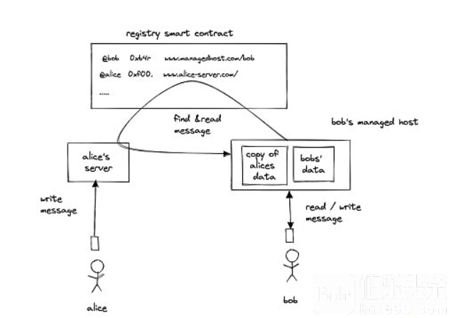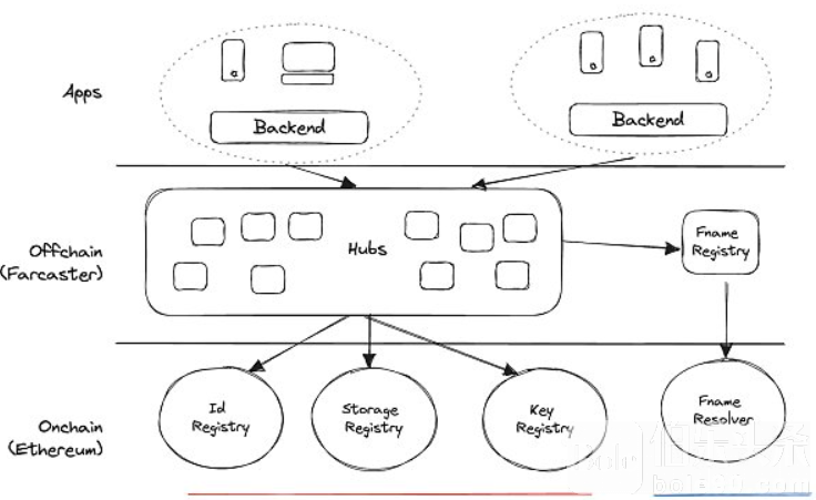 Farcaster通过部署在Optimism上的一组核心智能合约来实现其架构: · IdRegistry创建新帐户,允许用户转移和恢复Farcaster帐户。它还与ENS集成,使用户名可被合法所有者获取。 · Storage Registry将存储租给帐户。存储价格以美元计价,并使用Oracle转换为ETH。价格视供需情况而定。 · Key Registry通过帐户发布app密钥,这样它们就可以代表它们发布消息了。 正如你所看到的,上述智能合约都不发送或接收消息,这一职责被委托给了Hubs。Hubs是一个分布式网络,由Hubble实例组成,Hubble是一个使用Typescript和Rust构建的节点。 各节点负责验证、存储、复制消息,并对其对等节点进行评估。 通过验证来自某个用户帐户密钥的有效签名,进行消息级别的验证。 一旦消息被验证有效后,将通过利用CRRDT(无冲突复制数据类型)方法的异步进程将其存储在hub。 复制是通过使用diff sync和基于流行的libp2p代码库的gossip协议实现的。Hub定期选择一个随机节点来执行diff sync,比较消息哈希的Merkle tries,以查找漏掉的消息。 Hub具有强大的最终一致性架构,因为即使它们脱机了,也可以使用它们的对等节点重建状态。 对等节点对于维护协议的状态至关重要,所以它们相互评估。如果有节点不接收有效信息、落后或gossip太多,就可能会被忽略。