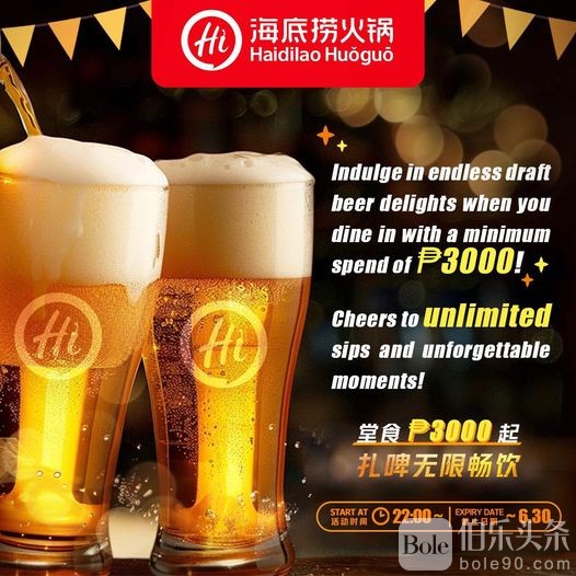 海底捞热情邀您前来品尝美食,仅需3000比索起,您即可尽情享受他们独特的烹饪艺术。更令人兴奋的是,搭配着无限畅饮的生啤酒,为您的用餐体验增添无限乐趣。这个美食之旅不仅是味觉上的享受,更是一次精彩的社交体验。