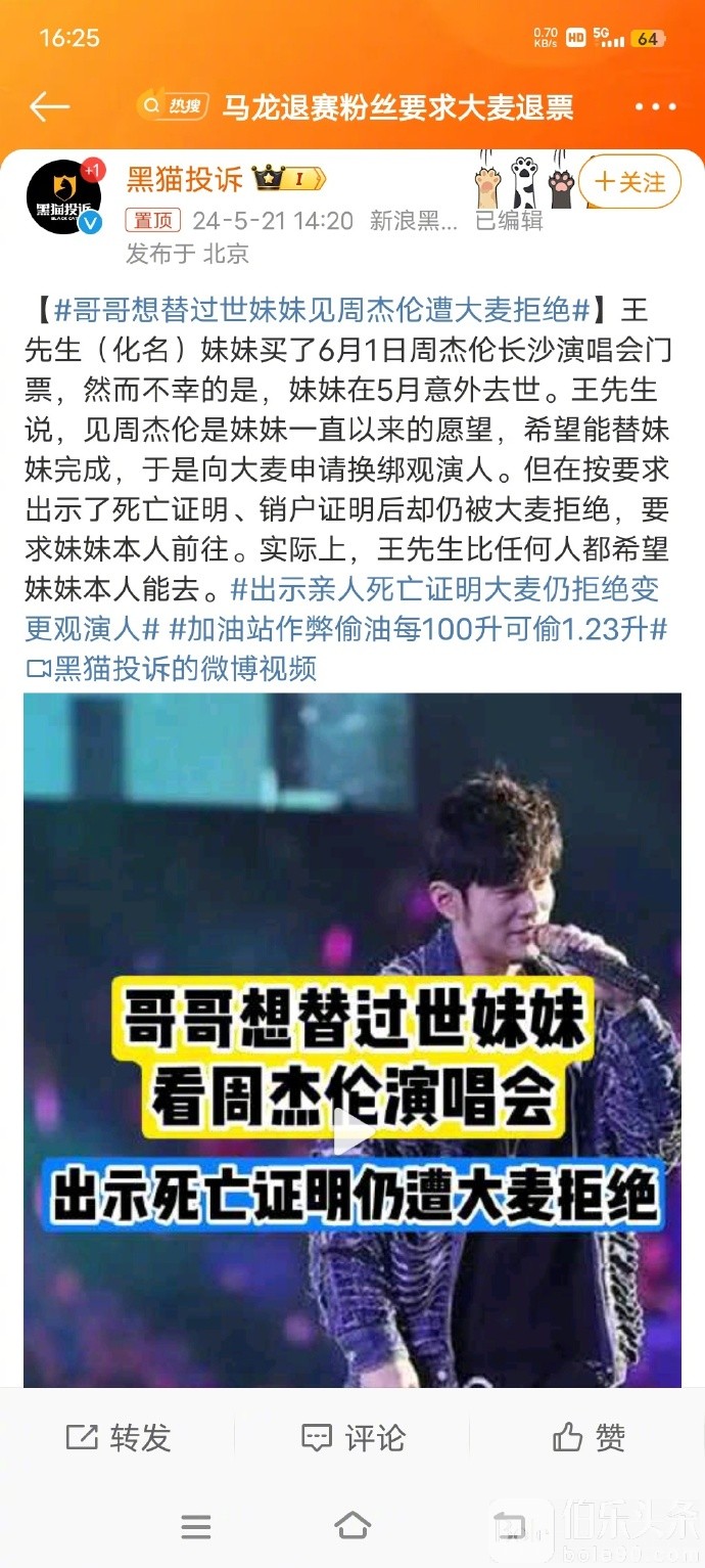 今天(5月21日)官方客服又回应称,无法换绑观演人,但可以提供死亡证明由客服反馈给专员看如何退票,以工作人员最终处理结果为准。目前不清楚是全额退还是部分退以及收不收手续费。