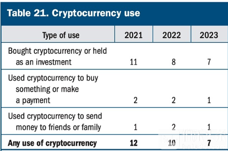 根据美联储最新的年度家庭调查,去年拥有或使用加密货币的美国成年人数量下降至约 1800 万。 根据美联储5月21日发布的《家庭经济与决策调查》(SHED),在截至去年10月的12个月里,接受调查的美国成年人中有7%使用加密货币,低于2022年的10%和2021年的12%。 只有1%的成年人表示他们使用加密货币作为支付方式或汇款,比2022年下降了一半,而7%的人购买或持有加密货币作为投资。