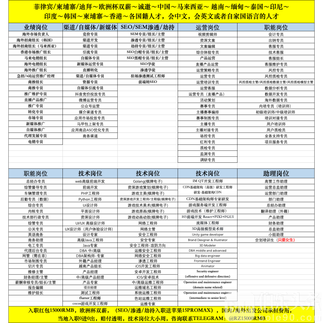 诚邀加入,世界杯双薪,业绩岗入职红包15000RMB。SEO入职送苹果15PROMAX,咨询联系TELEGRAM:@rz15000rmb