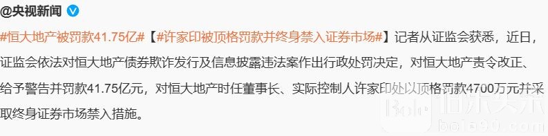 近日,证监会依法对恒大地产债券欺诈发行及信息披露违法案作出行政处罚决定,对恒大地产责令改正、给予警告并罚款41.75亿元,对恒大地产时任董事长、实际控制人许家印处以顶格罚款4700万元并采取终身证券市场禁入措施。