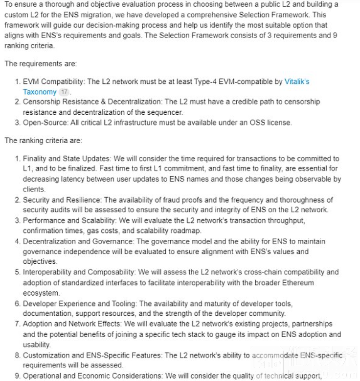 换句话说,每个 .eth 域都将拥有自己的个人注册表,而不是单一的平面注册表,从而可以根据用户的需求提供更大的灵活性和对子域和所有权的控制。 此外,ENSv2 旨在促进各种区块链之间更顺畅的集成。通过 CCIP-Read 网关和兼容解析器的结合,.eth 域名将能够以前所未有的方式跨不同网络进行可信连接。 Layer2 迁移计划向 ENSv2 的迁移将分阶段进行,以尽量减少干扰。 初始阶段包括部署新的通用路由器接口,然后在 L1 和 L2 上部署新的注册表合约。最终,用户将能够将他们的名字迁移到 L2,以享受更低的成本和更快的交易,但迁移是可选择的。现有域名将继续在以太坊上正常运行。 那么最大的问题是 ENS 社区会选择哪一个 L2? ENSv2 技术设计文档提到了“ENS Chain”,但这可能只是一个暂定的替代名称,直到正式选择网络为止。 也就是说,ENS 可以创建自己的 L2,例如在 Optimism 的超级链上,或者直接部署到 Optimism、Arbitrum、Base、Starknet 等。 我们将看看会发生什么,但 ENS Labs提出了一个选择框架来指导这一决策,涵盖以太坊虚拟机 (EVM) 兼容性等要求到强大的开发工具选项等排名标准。 ENS DAO 将在此做出最终批准决定。