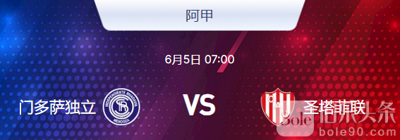 今天推荐的比赛是 2024-06-05 07:00 开赛的 阿甲 门多萨独立 VS 圣塔菲联[color=rgb(51 51 51/var(--tw-text-opacity))]