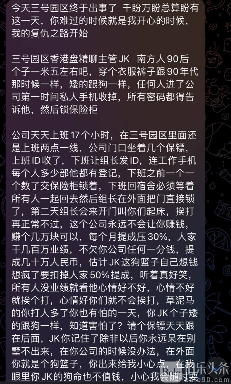 三号园区香港盘精聊主管JK   南方人90后  个子一米五左右吧,穿个衣服裤子跟90年代那时候一样,矮的跟狗一样,任何人进了公司第一时间私人手机收掉,所有密码都得告诉他,然后锁保险柜