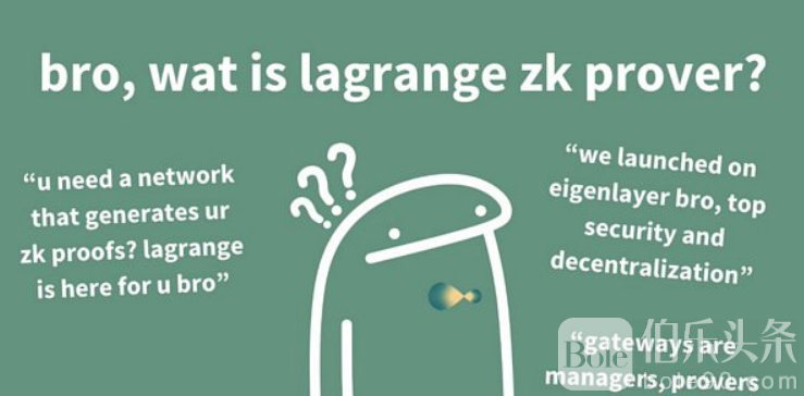 “你说过prover网络。” 完全正确。Lagrange提供了一个去中心化prover网络,或者说是包含多个prover的prover群组,如果你喜欢这么说的话。任何应用程序都可以使用prover网络来生成证明。为了实现这一点,Lagrange利用了EigenLayer再质押和网关。 “稍等一下……” 有了EigenLayer,Lagrange ZK Prover网络将具有与以太坊相同的安全级别。简单地说,任何想要生成证明的人都必须承诺正确且快速地完成证明生成,否则他们将失去一部分再质押ETH。 “那么他们就是prover了?” 完全正确。生成证明的prover是EigenLayer的操作员。他们为赚取奖励生成证明,并出资来保证他们将正确完成任务。一点不难。