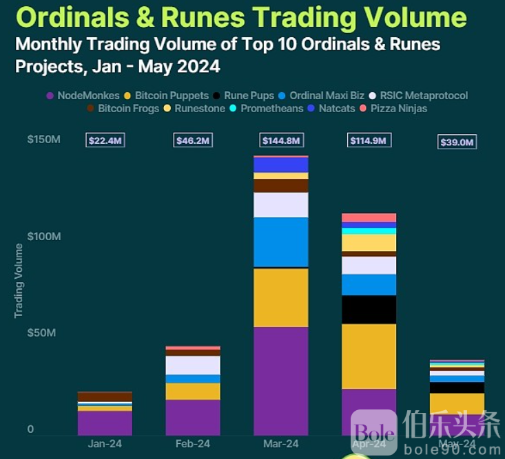 排名前 10 位的基于比特币的非同质化代币 (NFT)(包括 Ordinals 和 Runes)的总市值已飙升至 10.3 亿美元,2024 年 5 月的日均交易量为 225 万美元,证明了它们在 Web3 世界中日益突出的地位。 这一交易量主要由链上最受欢迎的项目推动,例如 NodeMonkes(2024 年 5 月的市值为 1.9825 亿美元即 2,880 BTC)、Bitcoin Puppets(市值为 1.4412 亿美元 1,815 BTC))和 Runestone(市值为 8785 万美元 1,124 BTC)。