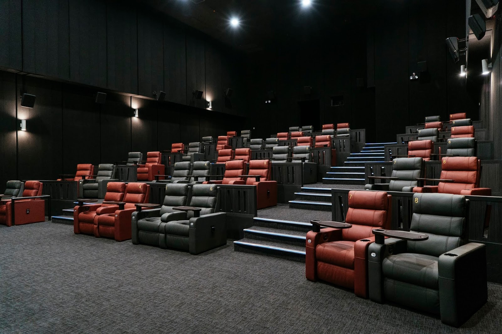 如果这里1-3号的电影院的座位感觉还不够舒服的话,各位小伙伴不妨可以试试这里的播映室,因为这里的座位不仅可以半躺,而且每张座位上都有一张可移动式的小桌子、杯架、呼叫按钮、插座跟一个台灯,这样想吃东西的话也不用怕需要摸黑。