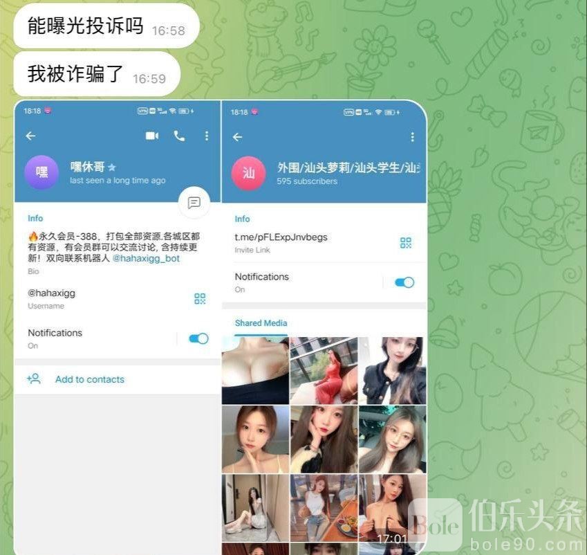 先是收会员费 88给了两个“妹子”电报,然后我联系妹子她说开好房拍房卡她就来,我拍房卡给他,他到了酒店外面拍了张照片,说要交600定金才上来,600给了又要400尾款,尾款给了又要防偷拍担保金1000,完了又1000后面还接着要钱我就没给了。