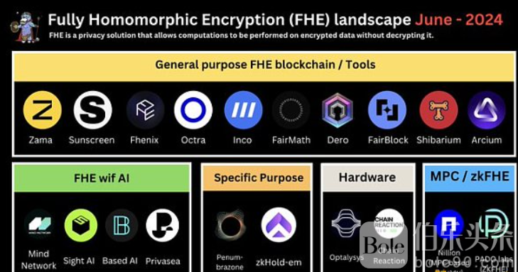 二、FHE 如何工作?你可以想象有一个盲盒,里面有谜题。然而,盲盒无法了解你给它的谜题的任何信息,但它仍然可以用数学计算结果。 FHE 的一些用例包括:隐私链上计算、链上数据加密、公共网络上的私密智能合约、机密 ERC20、私密投票、NFT盲拍卖、更安全的 MPC、抢先交易保护、无需信任的桥等等。 三、FHE 生态系统总体而言,链上 FHE 的格局可以概括为 5 个领域:1、通用 FHE;2、特定用例(应用)的 FHE/HE;3、FHE 加速硬件;4、带有 AI 的 FHE;5、替代解决方案 1、通用 FHE 区块链和工具它们是实现区块链机密性的支柱。这包括 SDK、协处理器、编译器、新执行环境、区块链、FHE 模块…… 最具挑战性的是:将 FHE 引入 EVM,即 fhEVM。 包括: fhEVM:Zama、Fhenix、Inco network、Fair Math FHE工具/基础设施: Octra、Sunscreen Tech、Fairblock、Dero、Arcium(前Elusiv) 、Shibarium 下面是每个项目的一句话总结。 2、适用于特殊用途应用的FHE/HEPenum:使用 tFHE 进行屏蔽交换/池的跨链 cosmos dex (appchain)。 zkHoldem:Manta Network上的扑克游戏,使用HE和ZKP来证明游戏的公平性。 3、加速硬件每次使用 FHE 进行密集计算(如 FHE-ML)时,引导以减少噪声增长都至关重要。硬件加速等解决方案在促进引导方面发挥着重要作用,其中 ASIC 表现最佳。硬件领域的成员包括:Optalysys、Chain Reaction、Ingonyama、Cysic