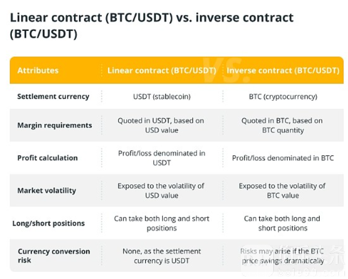 根据计算,交易员将从这笔交易中获利 0.00000164 BTC,这些利润将出现在他们的加密钱包中。那些想从资产价值上涨中获利的人有时会做多,这意味着他们押注价格上涨。在反向合约方面,做多头寸的投资者将从标的资产兑美元(在本例中为 BTC)升值中获益。 假设投资者选择做多与 BTC/USD 挂钩的反向合约。他们持有的比特币价值与加密货币的价格同步上涨。因此,他们持有的美元价值随着比特币价格的上涨而增加。比特币的价格和以美元计价的反向合约的价值直接相关,为投资者提供了从有利的市场条件中获利的简单机会。 三、正向期货合约与反向期货合约的区别线性期货合约以稳定币(如 USDT)结算,而反向期货合约以基础加密货币(如 BTC)结算。 在线性期货合约中,交易者使用和赚取相同的货币。例如,在以美元计价的比特币合约中,保证金和盈亏均以美元计价。在线性期货合约中,保证金和盈亏以报价货币计价,通常称为“香草”。因此,以美元计价的比特币香草期货合约以美元计价和结算。 相反,在反向期货合约中,交易者使用基础货币(例如比特币),但以报价货币(例如美元)赚取盈亏。 线性期货合约和反向期货合约的比较: