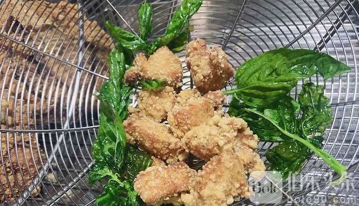 另外点了一份咸酥鸡,九层塔和咸酥鸡下油锅一起炸,整个香气碰撞之後叠加在一起,忍不住想先尝一口
